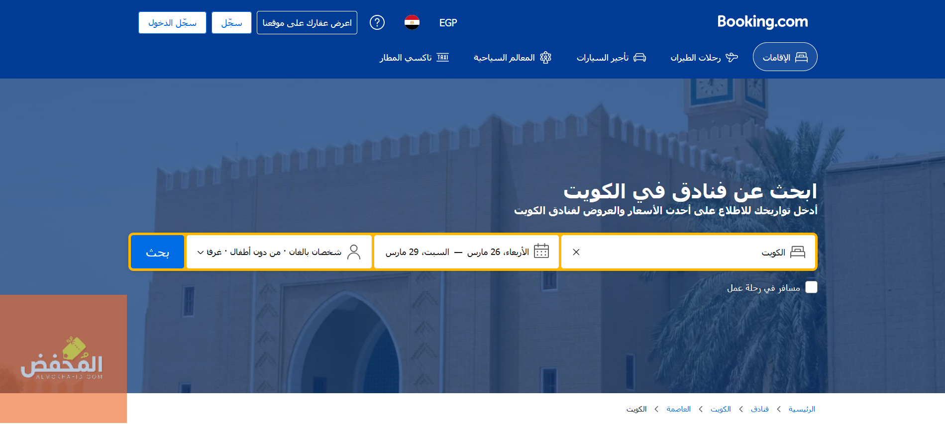 1- ادخل إلى الموقع الرسمي لفندق بوكينج الكويت عن طريق الرابط المباشر المعروض أعلى هذه المقالة حتى تتمكن من استعراض الواجهة الرئيسية للموقع وأفضل الوجهات المعروضة.