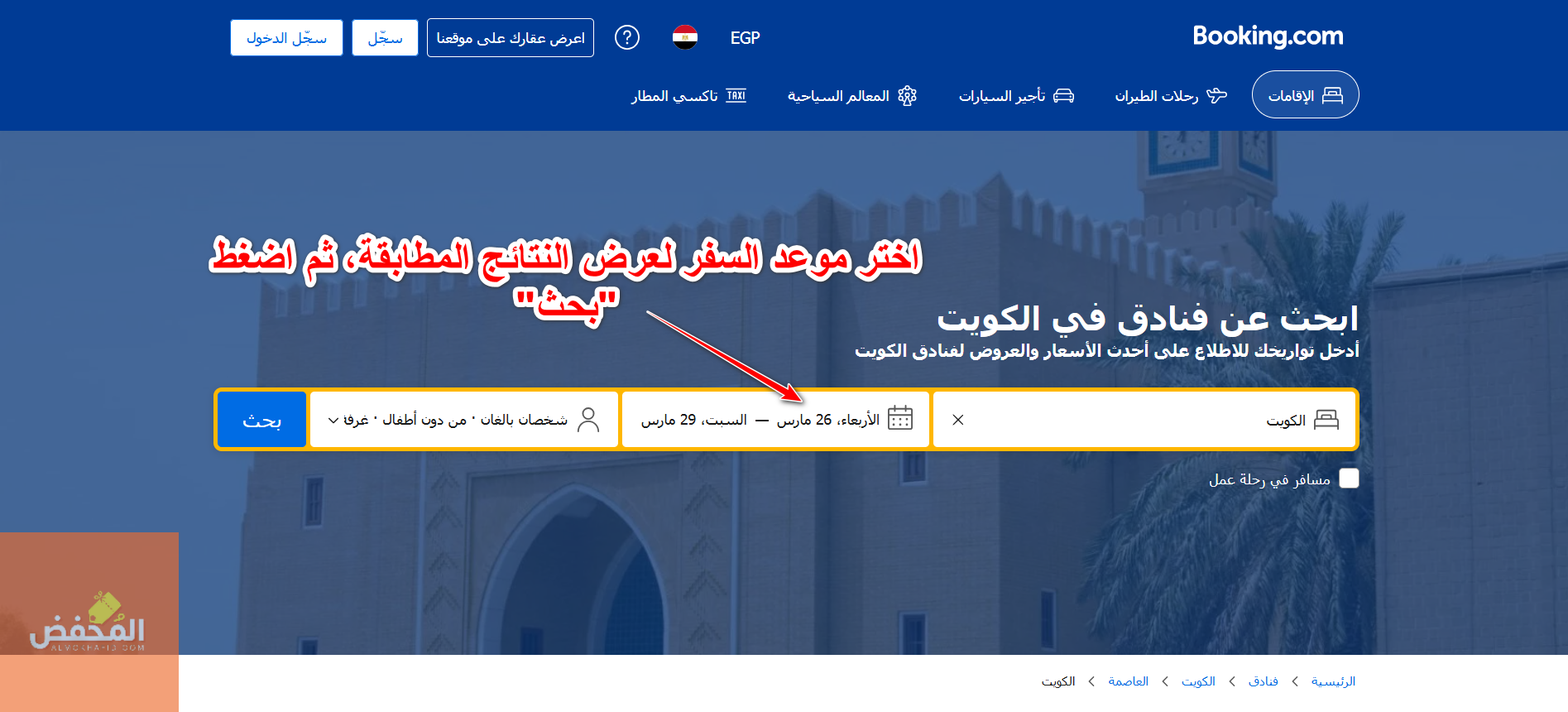 3- أدخل الوجهة الخاصة بك، وموعد الإقامة وعدد الأفراد، ثم اضغط على “بحث” حتى تتمكن من عرض النتائج المطابقة والتي يمكنك الاختيار من بينها لاحقًا وحجز غرفتك بسهولة من خلالها.