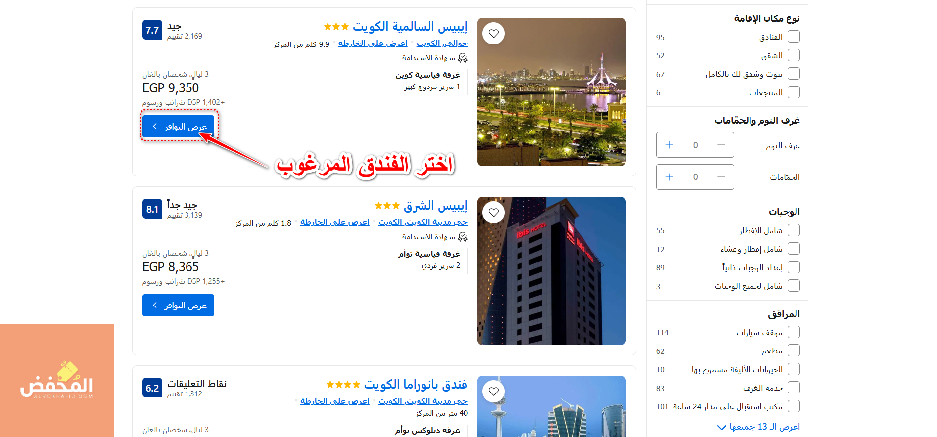 4- اطلع على النتائج المعروضة والمطابقة للبحث، ثم اضغط على أيقونة “عرض التوافر” حتى تتمكن من استعراض كافة الغرف المتاحة في الفندق المحدد، ومن ثم اختيار الغرفة المرغوبة.