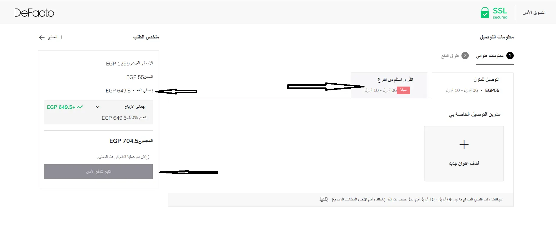استكمال عملية الشراء بعد التخفيض الفوري واختيار وسيلة الدفع.