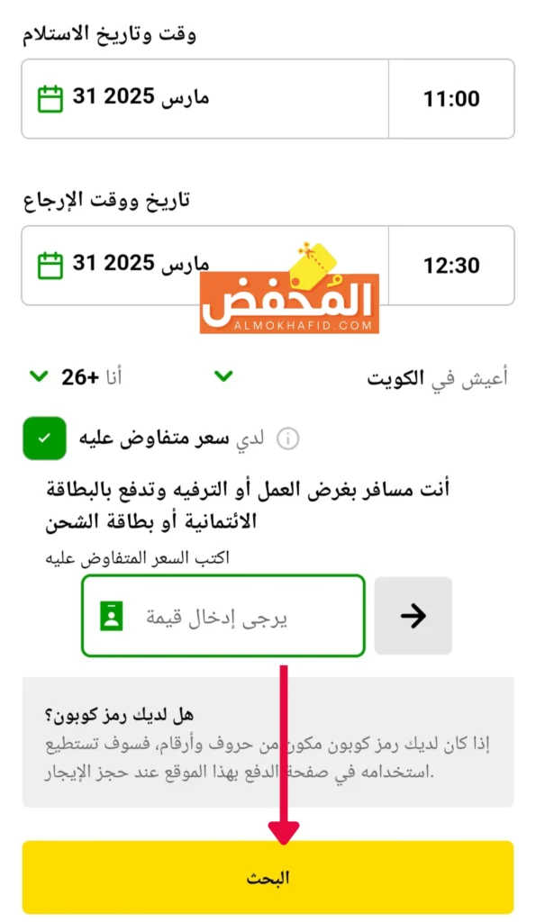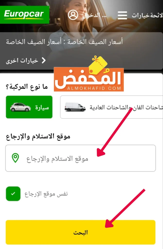 1. اذهب إلى موقع يورب كار، حدد موقعك، ووقت وتاريخ الاستلام، وتاريخ ووقت الإرجاع، حدد مكان الإقامة وعمرك، ثم اضغط على البحث.