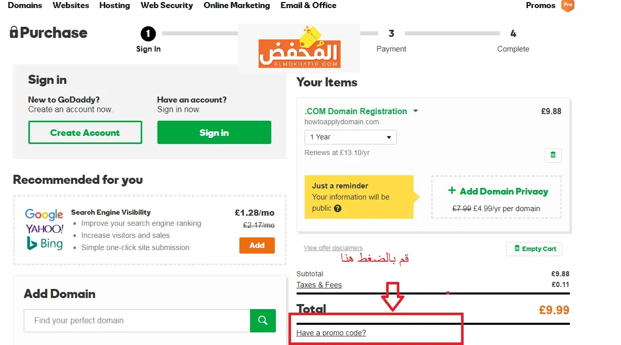من قبل إكمال عملية شراء النطاق الخاص بك تذكر ادخال كود خصم GoDaddy في صفحة الدفع لكي تتمكن من الاستفادة بخصم كبير يصل إلى 30%
