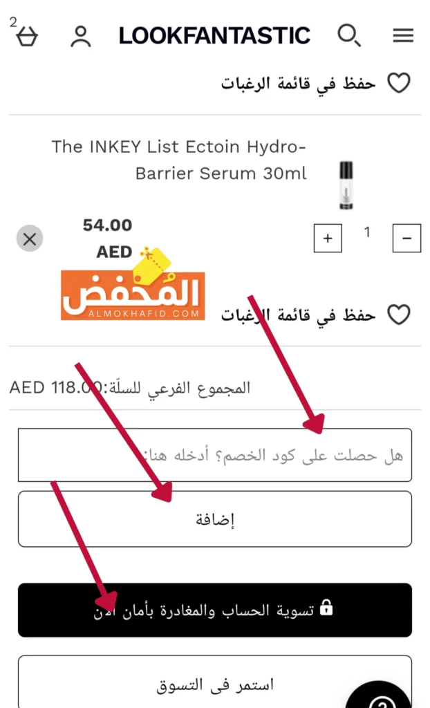 5. سجلي رمز الخصم الذي قمت بنسخه من موقع المخفض، ثم انقري على إضافة للحصول على نسبة التخفيض المفترض على إجمالي فاتورتك الشرائية.