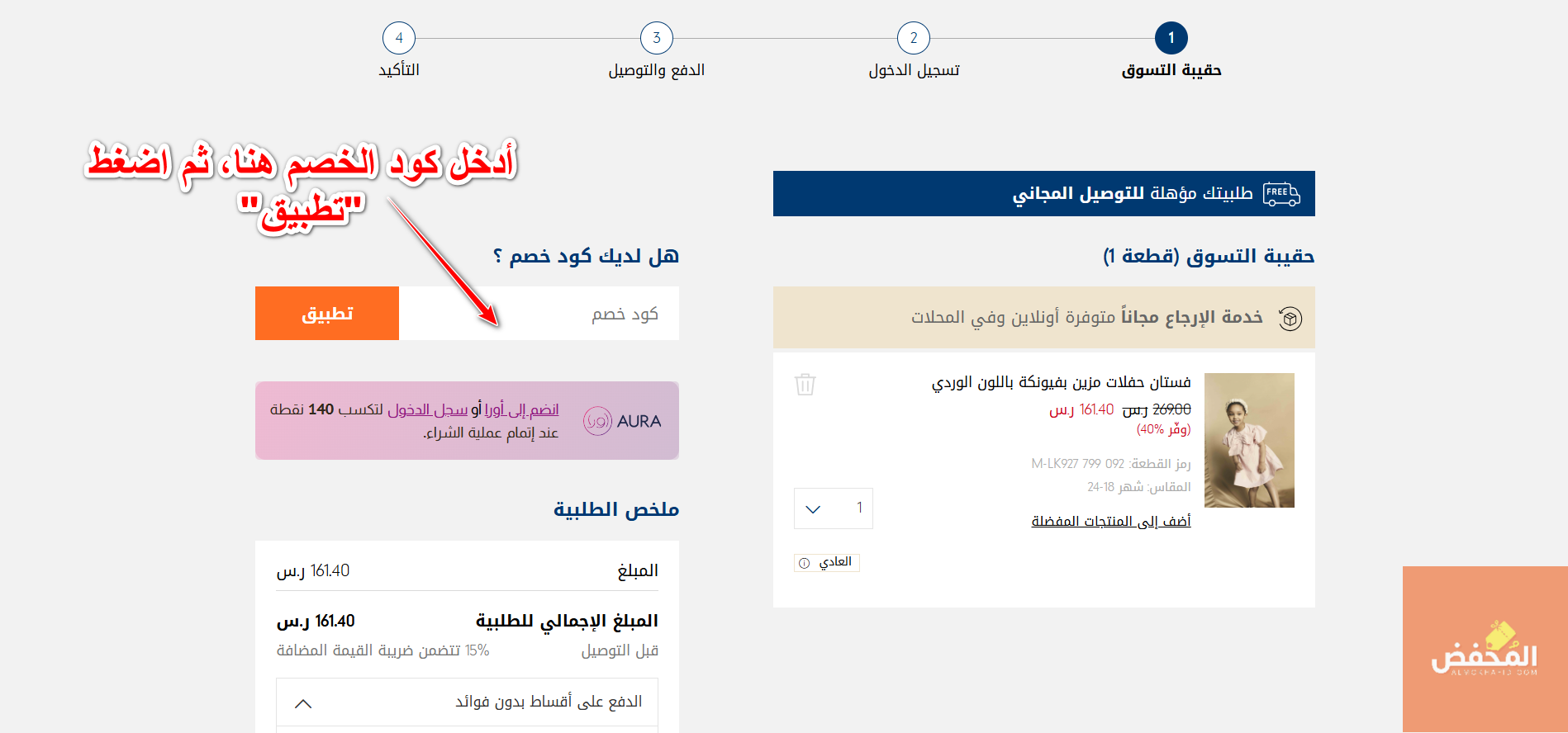 5-توجه إلى سلة المشتريات الخاصة بك، ثم انسخ كود خصم مذركير الكويت وقم بلصقه في الخانة المشار إليها بالسهم في الصورة التالية، واضغط “تطبيق” حتى تتمكن من الحصول على الخصومات التي يوفرها بشكل فوري.