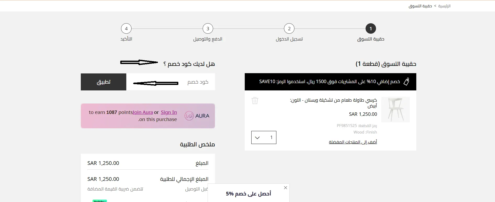افتح السلة وضع كود الخصم في الخانة المخصصة ثم اضغط على إتمام عملية الشراء.