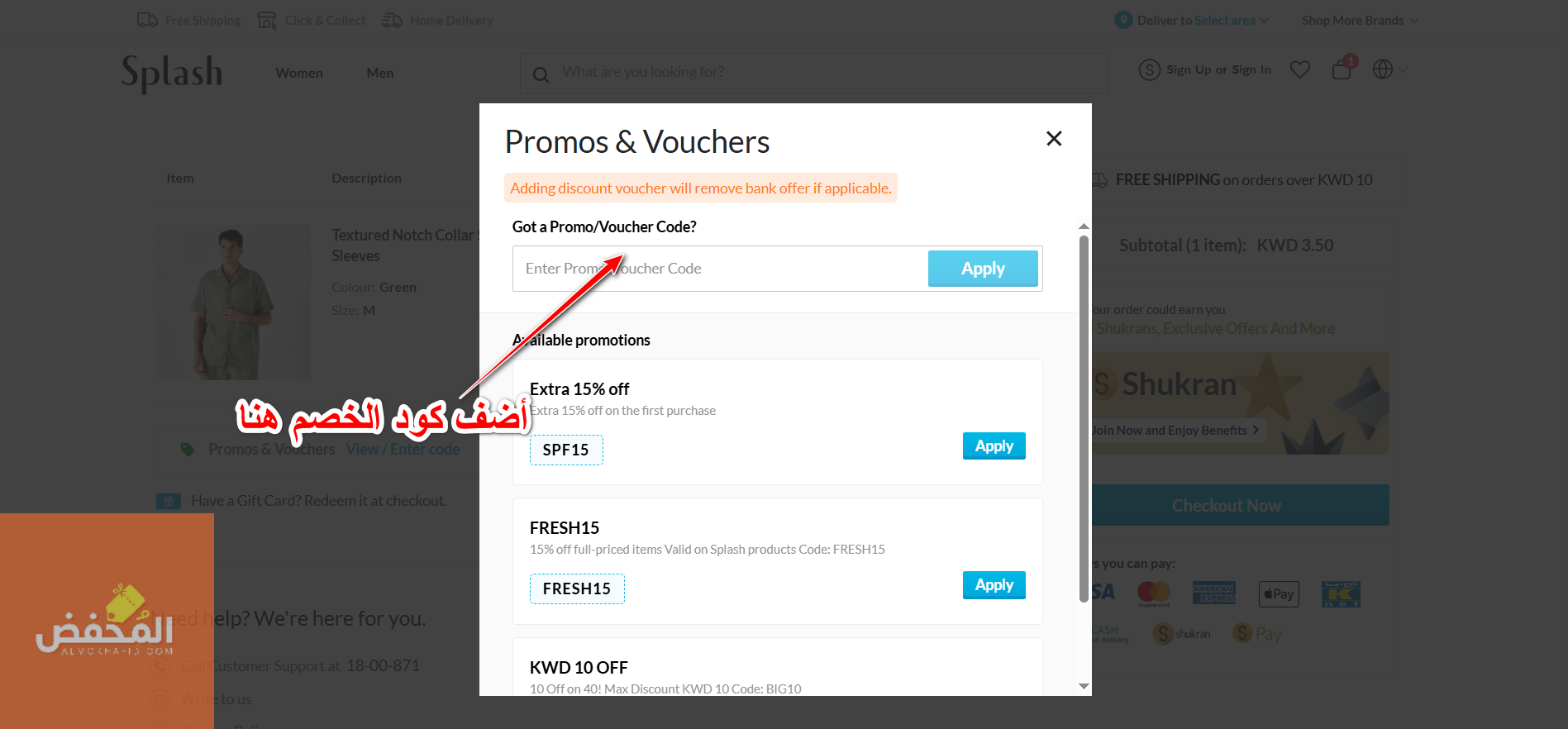 5- انسخ رمز خصم سبلاش الكويت وقم بلصقه في الخانة المحددة والمشار إليها بالسهم في الصورة التالية، ثم اضغط “تطبيق” حتى تحصل على الخصومات المميزة على مشترياتك من سبلاش بشكل فوري.