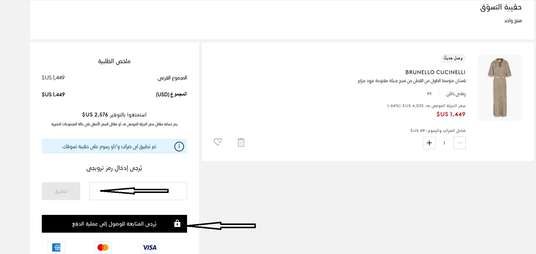 افتح الحقيبة للتأكد من كافة البيانات وضع كود الخصم في الخانة المخصصة ثم المتابعة إلى الدفع.