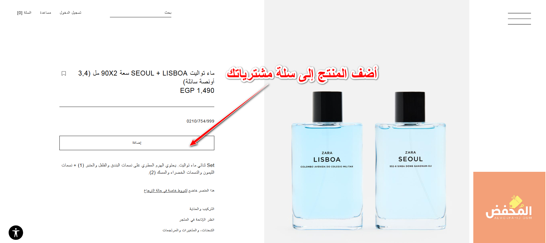 4- اضغط على أيقونة “إضافة” والمشار إليها بالسهم التالي حتى تتمكن من إضافة المنتج إلى حقيبة مشترياتك، وبالتالي إتمام طلب الشراء لاحقًا من خلالها